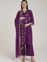 Purple Cotton Maternity & Nursing A-Line Kurta Set with Dupatta