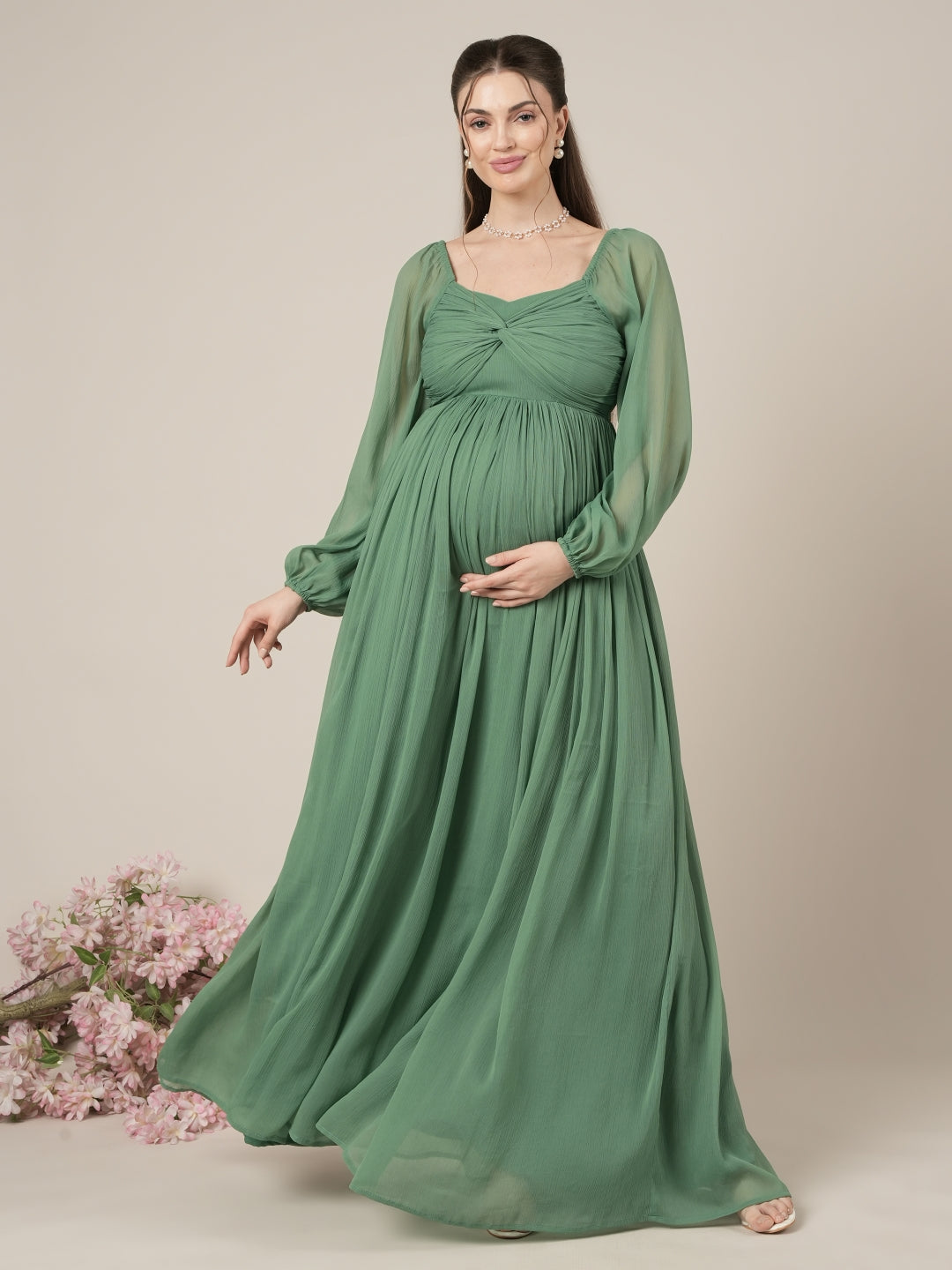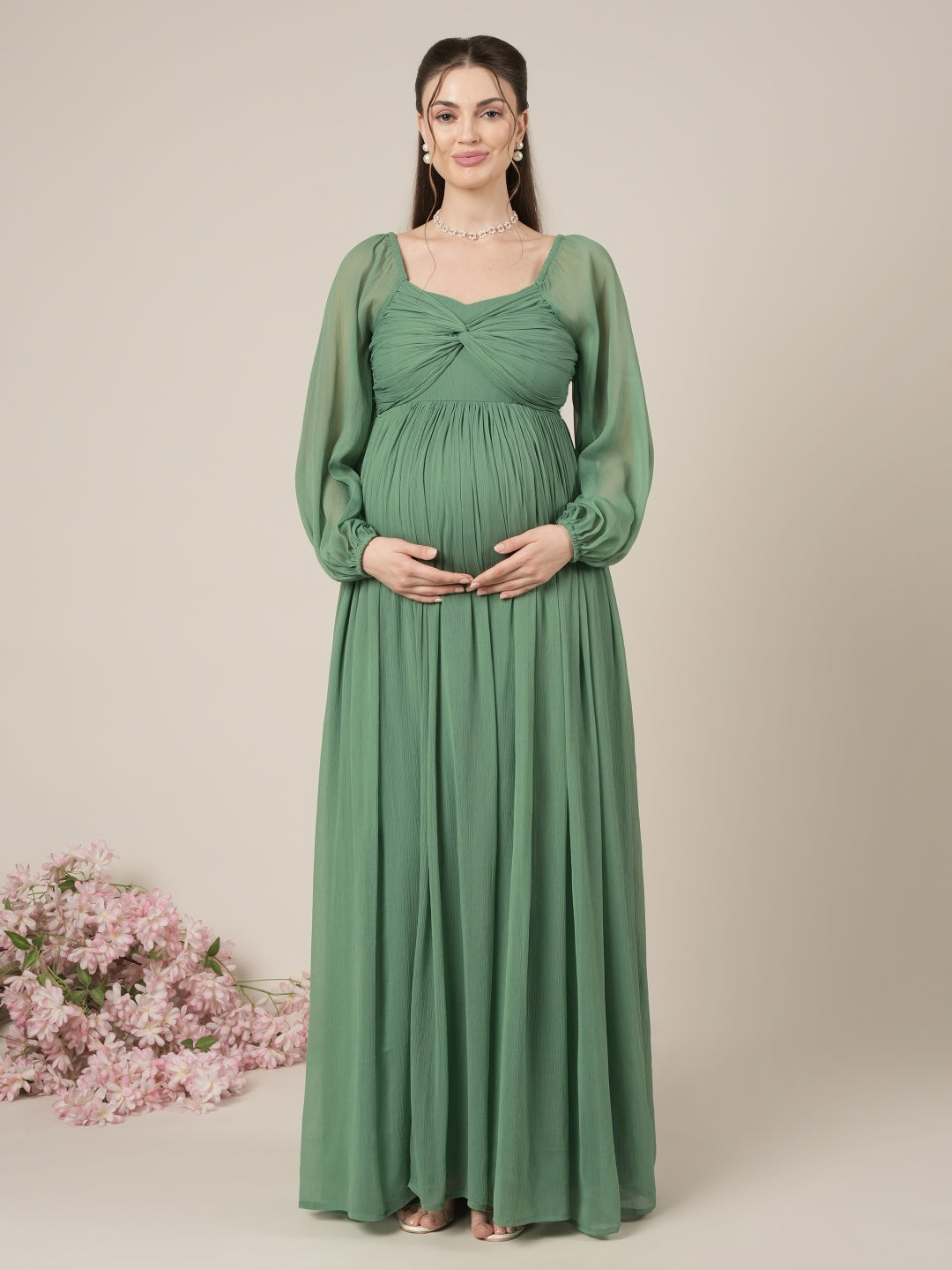 Green Maternity Party Maxi Dress with Long Sleeves