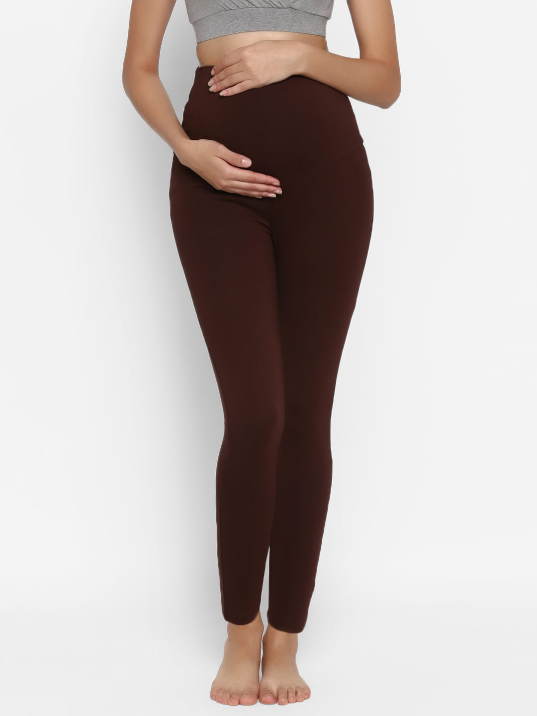 - High-rise full length maternity leggings with pockets that gently cover a pregnant belly.