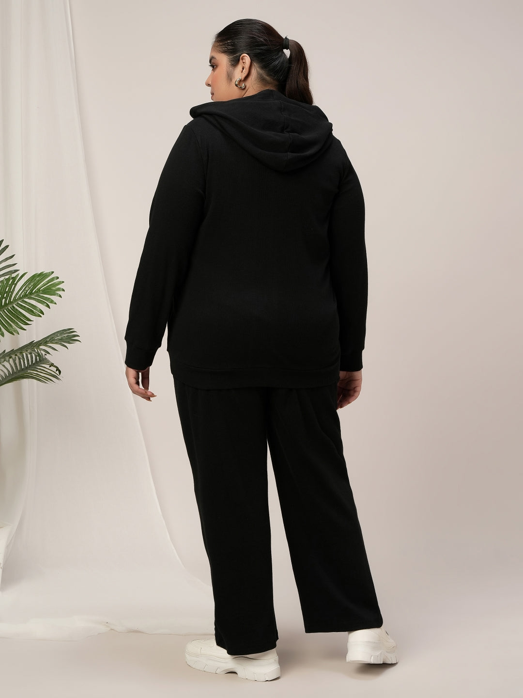 Women’s plus size lounge pajama co-ord set in black blends stretch comfort, relaxed fit, and everyday versatility. Crafted from soft cotton rib knit with high 4-way stretch for flexibility, breathability, and all-day ease. The zip-up hoodie features a hooded neckline, long sleeves, and side pockets for cozy layering and functional comfort. Matching high-rise wide-leg pants are designed with an adjustable drawstring, relaxed fit, and flowing silhouette for effortless movement. Perfect for lounging, yoga, travel, or casual wear, this timeless black co-ord set delivers softness, stretch, and modern style for relaxed living.