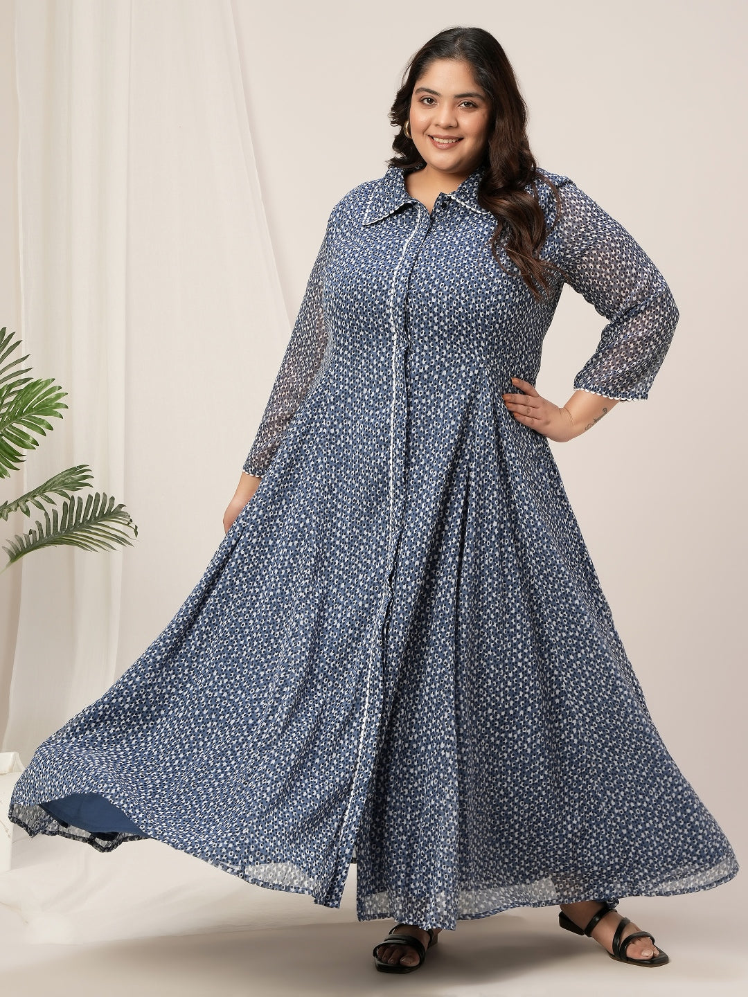 This Women's Plus Size Polka Dot Dress blends timeless charm with everyday comfort. Crafted from lightweight chiffon and fully cotton-lined, it features a relaxed, flowy fit that flatters all body types. The collared neckline and full button-front design add a polished touch, while the cuff sleeves and lace detailing enhance its feminine appeal. Designed with side pockets for practicality and a soft drape for ease of movement, this blue maxi shirt dress is perfect for casual wear, workdays, or relaxed brunch outings.