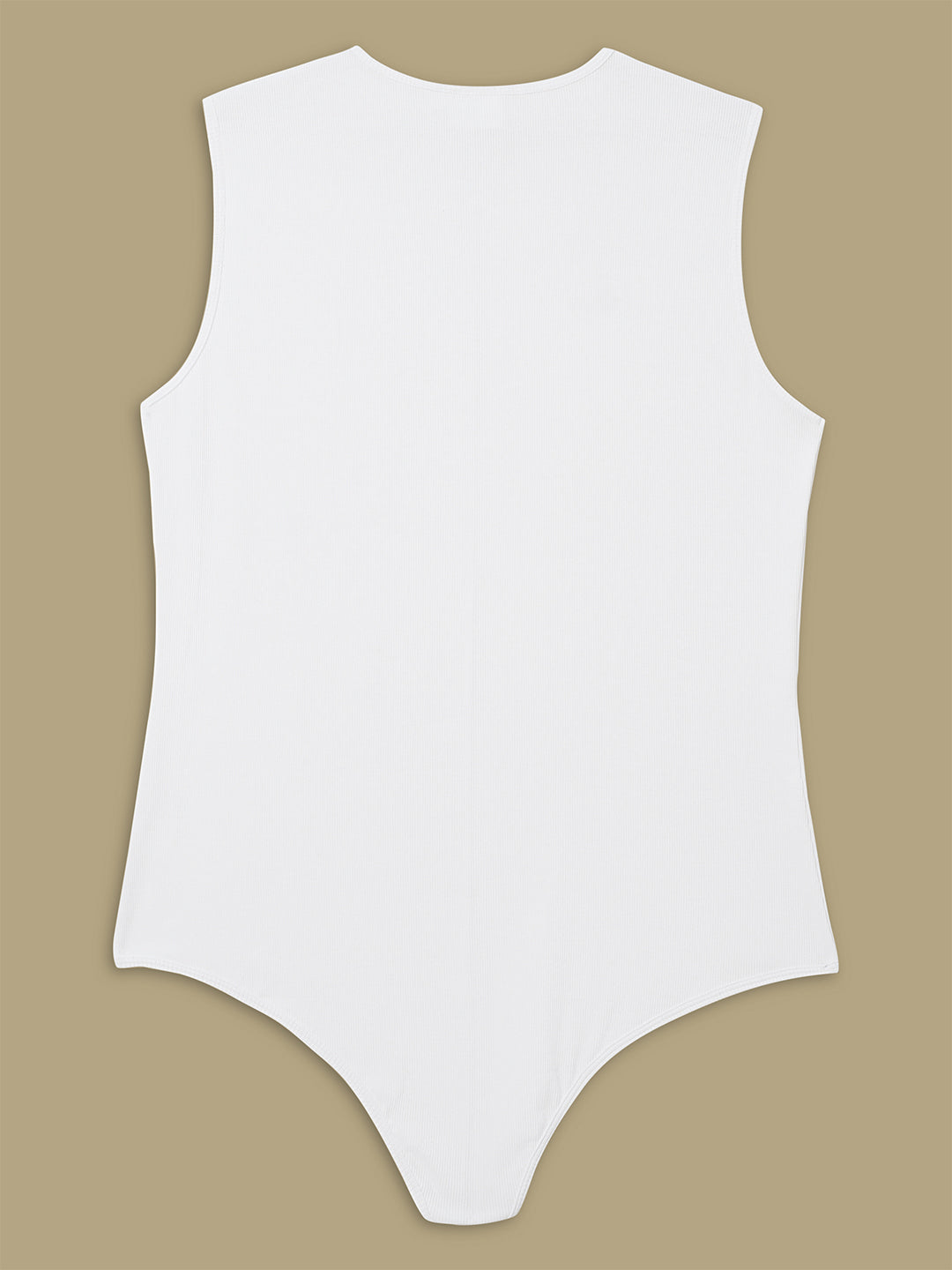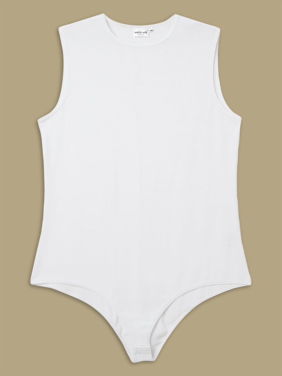 Women’s plus-size white bodysuit designed in soft stretch cotton rib knit for breathable comfort and a smooth, sculpting fit. Features a sleeveless cut and round neckline for timeless appeal. Includes a convenient snap closure and slip-on wear for daily ease. Ideal for layering or pairing with skirts and pants for polished casual and office outfits.