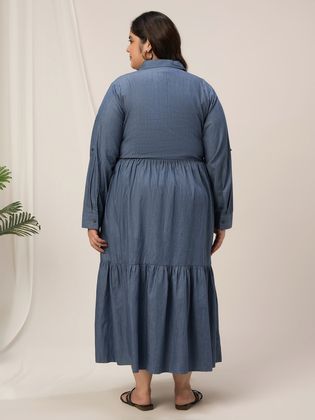This Women's Plus Size Denim Maxi Dress is designed for all-day comfort and timeless style. Made from soft cotton denim, it features a relaxed fit with an empire waist for a flattering silhouette. The button-front design and the tiered hem adds a feminine touch. Full cuff sleeves with adjustable tabs make it perfect for versatile styling across seasons. With handy side pockets and a collared neckline, this solid blue shirt-style maxi dress transitions effortlessly from workwear to casual outings or brunch.