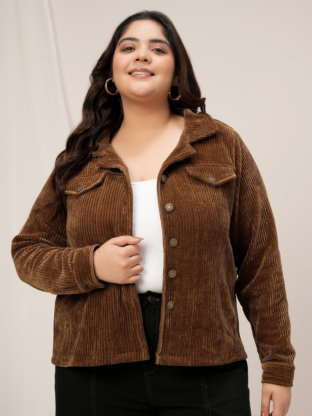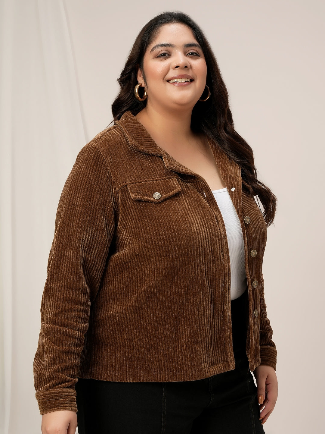 Women’s plus size brown corduroy jacket combines soft texture, structure, and winter warmth. Crafted from rich corduroy fabric with a button-down design and long sleeves for a cozy, sophisticated finish. The textured material adds depth, making it perfect for casual, office, or travel looks. A stylish outerwear essential that elevates your winter wardrobe with timeless charm.