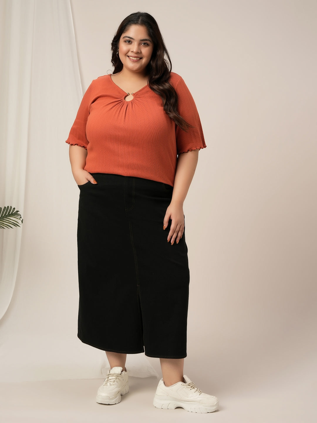 Women’s plus size black denim skirt crafted from stretch denim for comfort and flexibility. Designed in maxi length with a relaxed fit for easy movement. Features high-rise waist for a flattering shape and secure hold. Includes functional pockets for convenience and style. Front button and zip closure ensure effortless wear. A timeless straight denim design perfect for work, travel, and everyday wear.