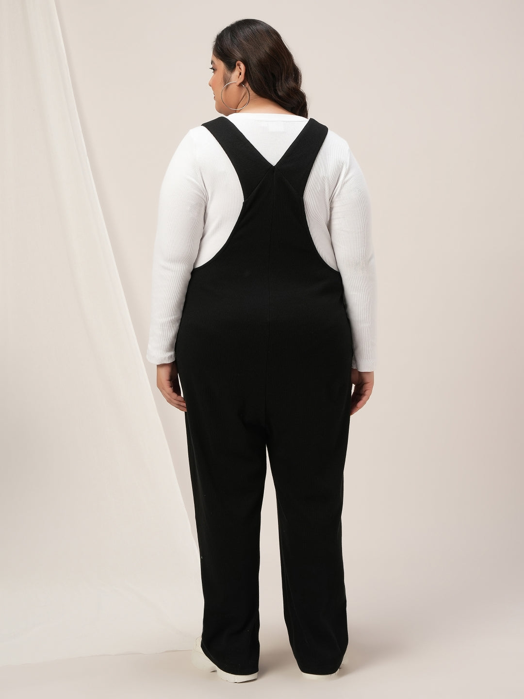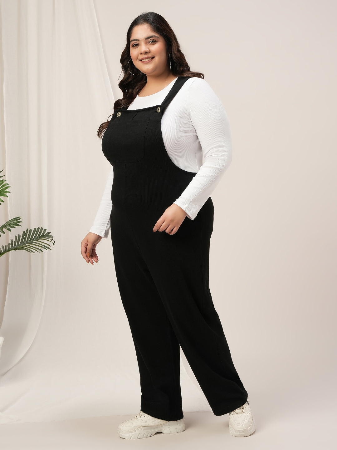 Women’s plus size women's dungaree in black blends comfort and versatility for daily wear. Crafted from stretch cotton rib knit, it offers a relaxed fit silhouette with a full length design for all-day ease. The square neck and button closure enhance its casual, functional appeal. Featuring center pocket for convenience and a stretch fabric for flexibility, it’s ideal for casual, everyday wear, travel. The overall, dungaree style and straight cut shape create a flattering look suitable for casual, workwear occasions.