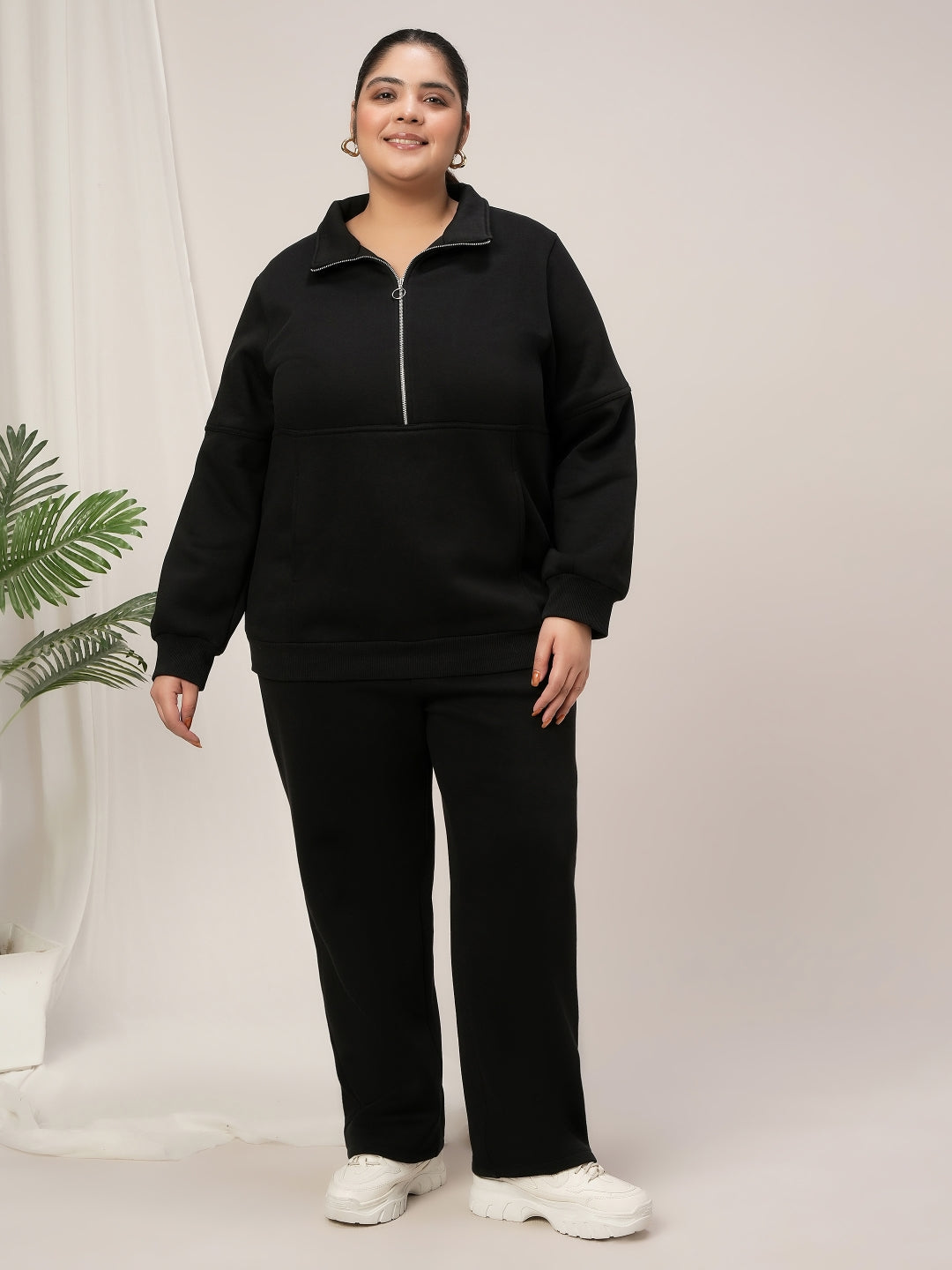 Women’s plus size fleece warm co-ord set in black offers cozy warmth, functional comfort, and timeless winter style. Made from soft cotton fleece-backed jersey with medium two-way stretch for flexibility and ease of movement. The zip-up sweatshirt features a high neck, long sleeves, and side pockets for a snug, polished look ideal for cold-weather layering. Matching high-rise straight-fit pants are fully fleece-lined for insulation and softness, featuring a relaxed straight-leg silhouette, easy pull-on closure, and two functional pockets for convenience. Perfect for lounging, travel, or casual outings, this set delivers warmth, comfort, and effortless style all season long.