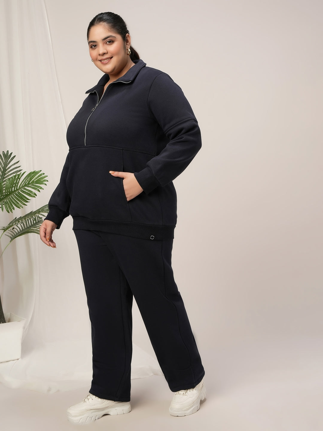 Women’s plus size fleece warm co-ord set in navy blue combines cozy warmth, softness, and everyday functionality. Made from cotton fleece-backed jersey with medium stretch for flexibility and comfort. The zip-up sweatshirt features a high neck, long sleeves, and side pockets for a snug, structured fit perfect for cold-weather layering. Matching high-rise straight-fit pants are fully fleece-lined for extra insulation and softness, offering a relaxed straight-leg silhouette and easy pull-on closure. Finished with two functional side pockets, this versatile set is ideal for lounging, travel, or casual winter outings — delivering comfort, mobility, and timeless style all season long.