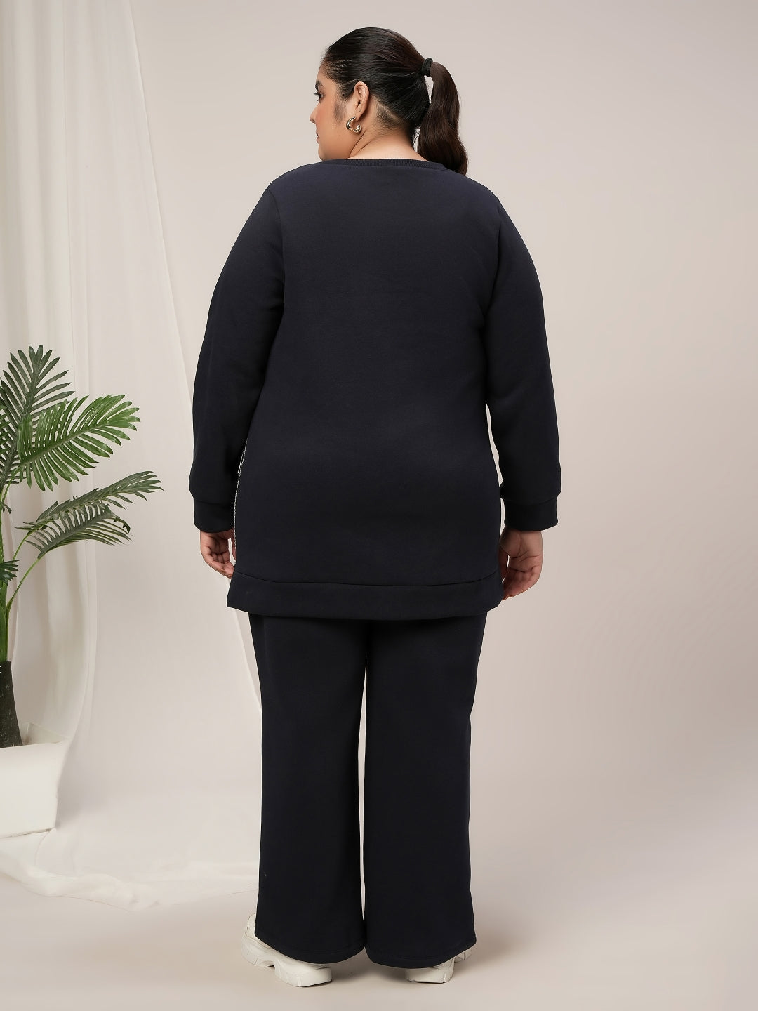 Women’s plus size fleece winter co-ord set in navy blue combines warmth, comfort, and timeless winter style. Made from soft cotton fleece-backed jersey with medium two-way stretch for flexibility and ease. The pullover sweatshirt features a round neck, long sleeves, and a functional side-zip closure for a modern, cozy look. Matching high-rise flare pants are fully fleece-lined for insulation and comfort, designed with a relaxed bootcut fit, pull-on closure, and two functional pockets for convenience. Perfect for lounging, travel, or casual winter outings, this set delivers effortless warmth, flexibility, and everyday elegance for the cold season.