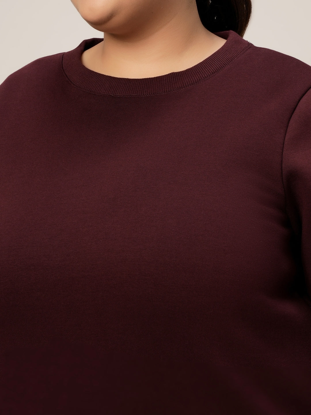 Women's plus-size sweatshirt in maroon, made from cotton fleece-backed jersey, is designed for warmth and everyday comfort. This winter staple offers a gentle two-way stretch, featuring long sleeves, a classic round neckline, and an easy pullover silhouette accented by a side-zip closure. Perfect for laid-back style, travel, or casual lounging, it blends coziness with a timeless, effortless look.