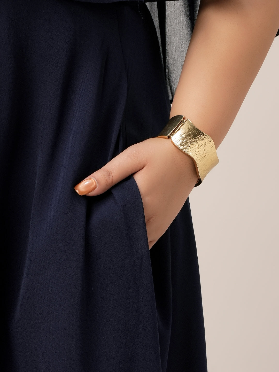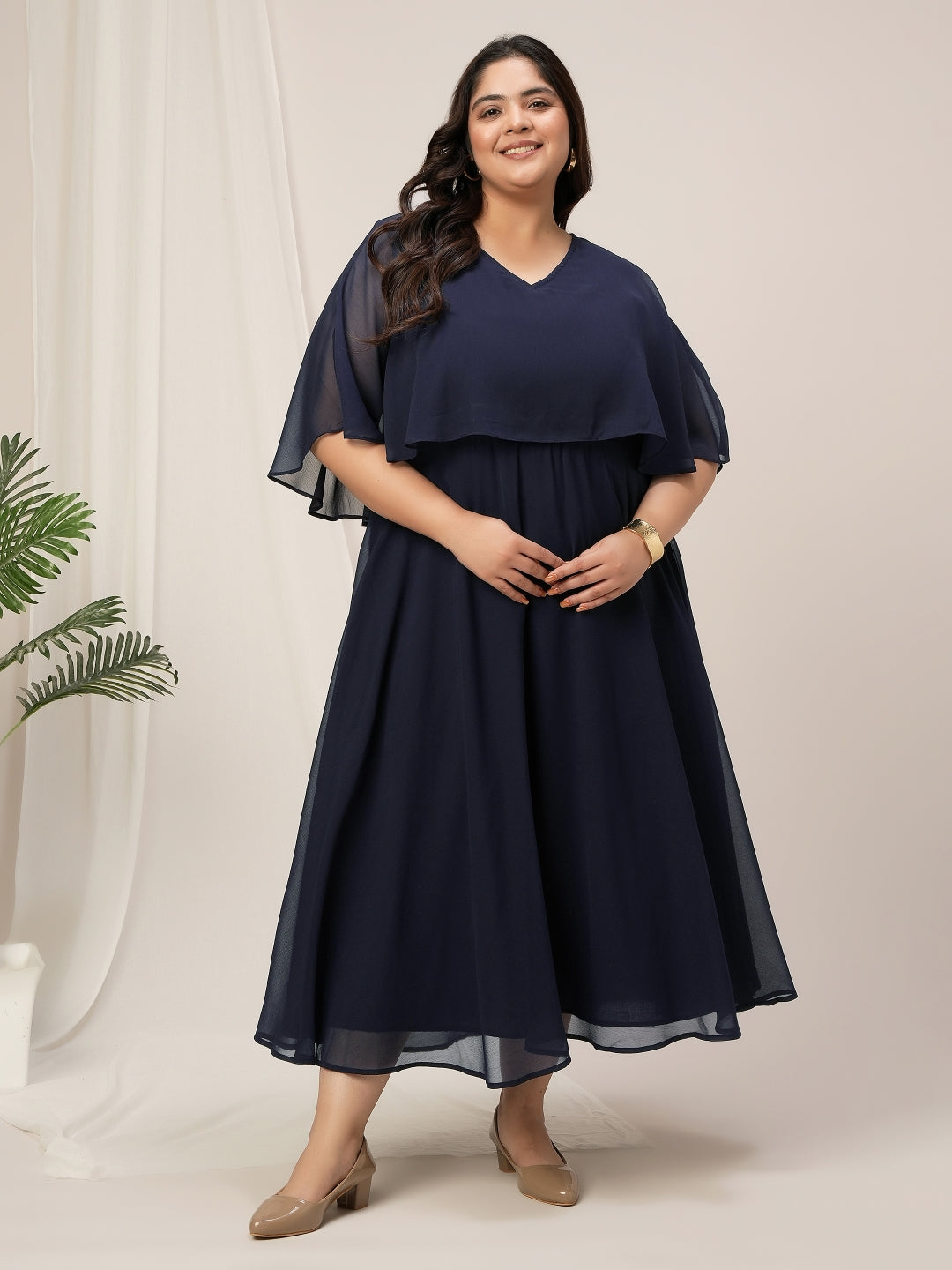 This Women's Plus Size Georgette Midi Dress blends comfort with understated elegance. Made from flowy georgette and fully cotton lined, it features a flattering empire waist and a V-neckline that enhances the feminine silhouette. The layered cape sleeves add graceful movement, giving it a sophisticated touch ideal for both formal and evening wear. Its fit-and-flare design, pullover style, and practical side pockets ensure ease and comfort all day long. Perfect for parties, cocktails, or day-to-night occasions, this navy blue midi dress combines effortless style with functional design.