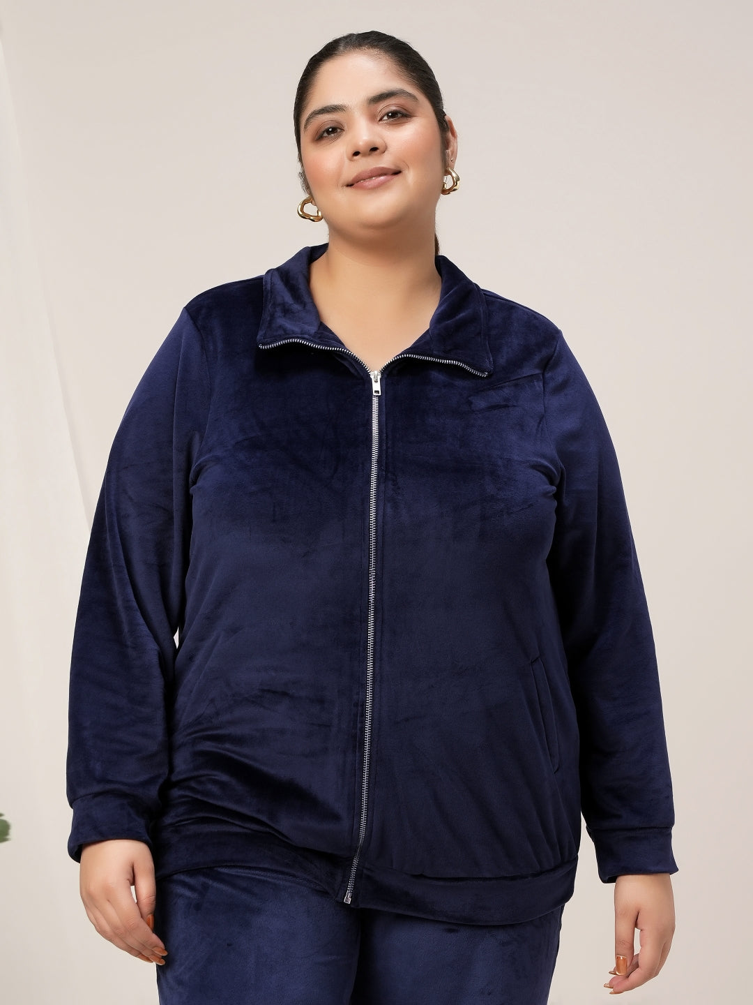 Women's plus size jacket in navy blue, made from stretch velour velvet for winter comfort, offering high 4-way stretch with side pockets, long sleeves, high-neck collar, and zip-up closure. A cozy winter layer with soft double-sided velvet texture.