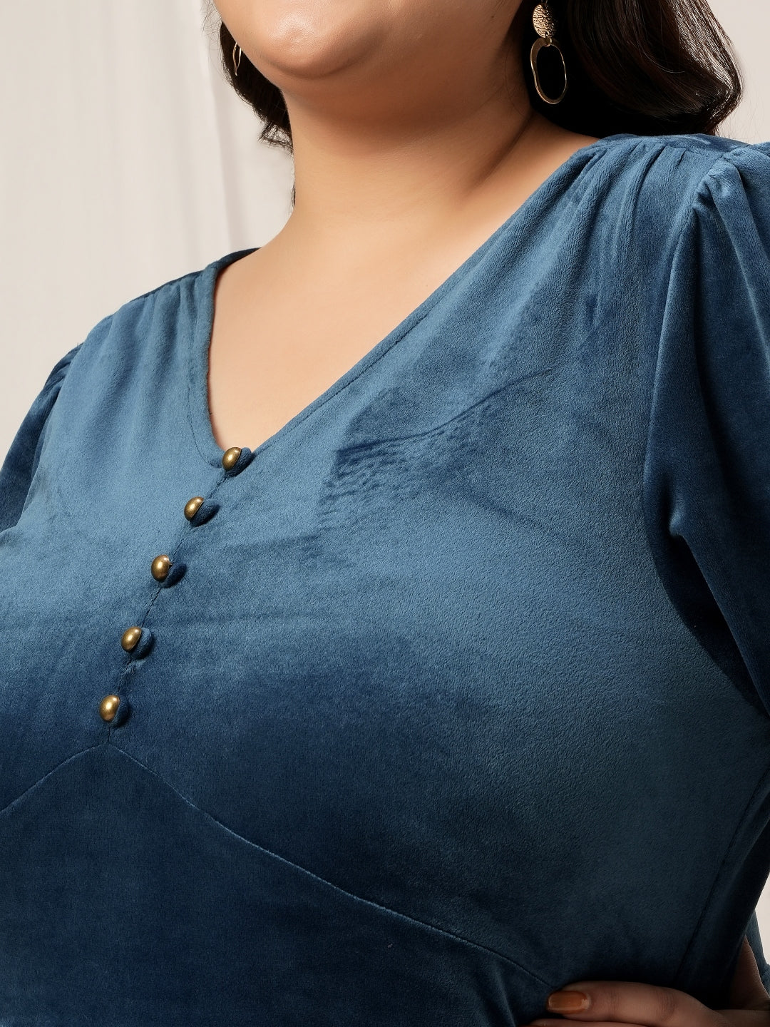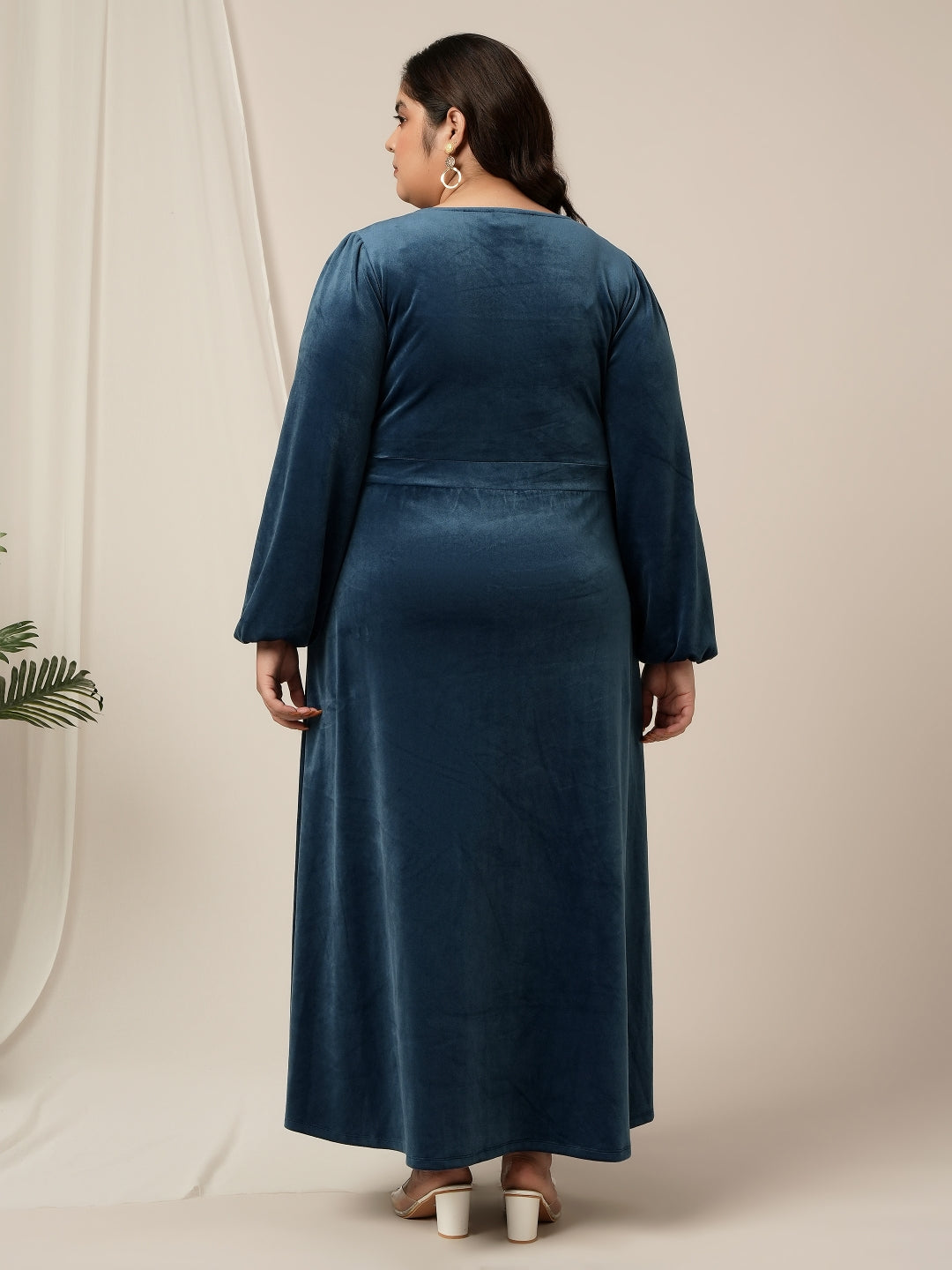 This Women's Plus Size Velvet Maxi Dress combines luxurious comfort with elegant style. Crafted from stretch velour, it offers a soft texture and a beautiful drape that flatters every curve. The V-neckline and empire waist create a feminine silhouette, while the balloon sleeves add a graceful touch. Designed with a relaxed fit and high 4-way stretch for easy movement, this dress ensures warmth and comfort through fall and winter. Complete with decorative front buttons and practical side pockets, this blue gown is perfect for evening events, parties, or special occasions.