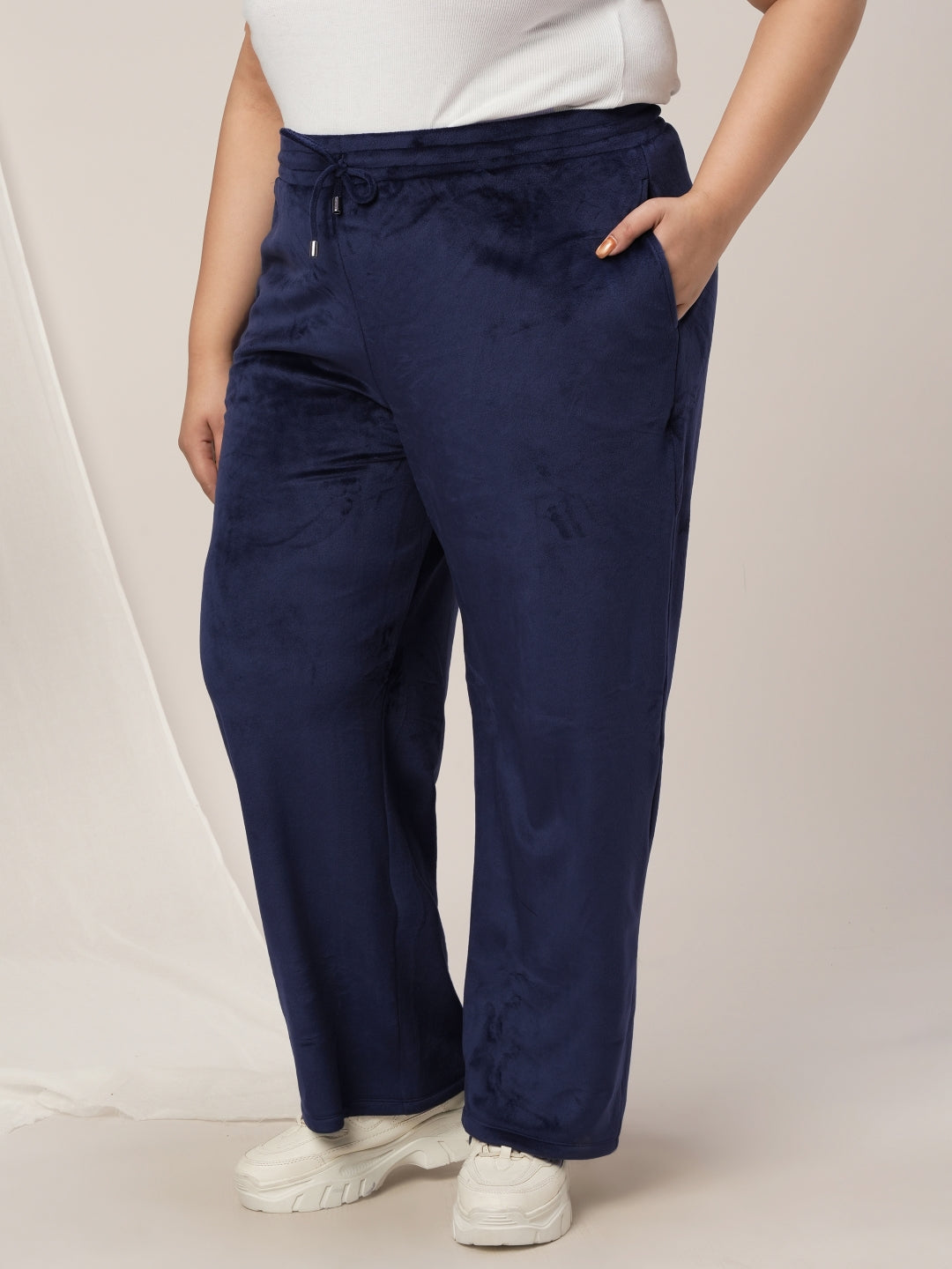 Women Plus Size Wide-Leg Velvet Pants- Navy Blue