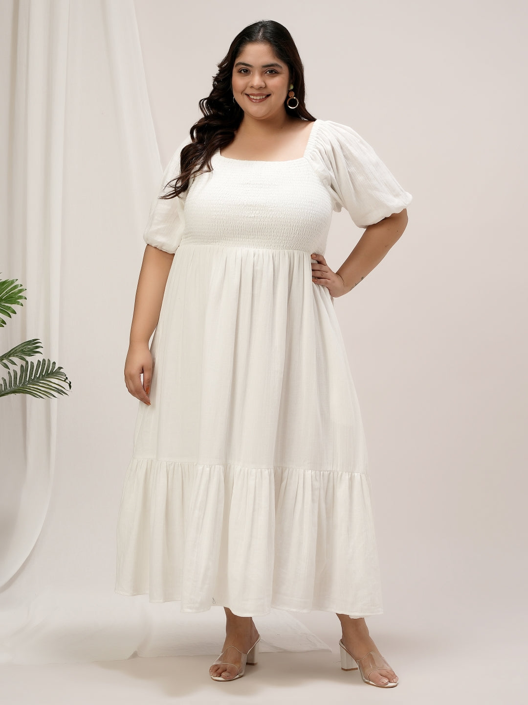 This Women's Plus Size White Cotton Maxi Dress is crafted from soft double cotton gauze for a lightweight, breathable feel. Designed with a relaxed fit and empire waist, it offers an effortlessly flattering silhouette. The smocked bodice and puff sleeves add a feminine touch, while the tiered hem brings graceful flow and movement. With practical side pockets and a soft cotton lining for comfort, this pullover dress is perfect for brunches, vacations, or relaxed resort wear, combining simplicity with timeless elegance.