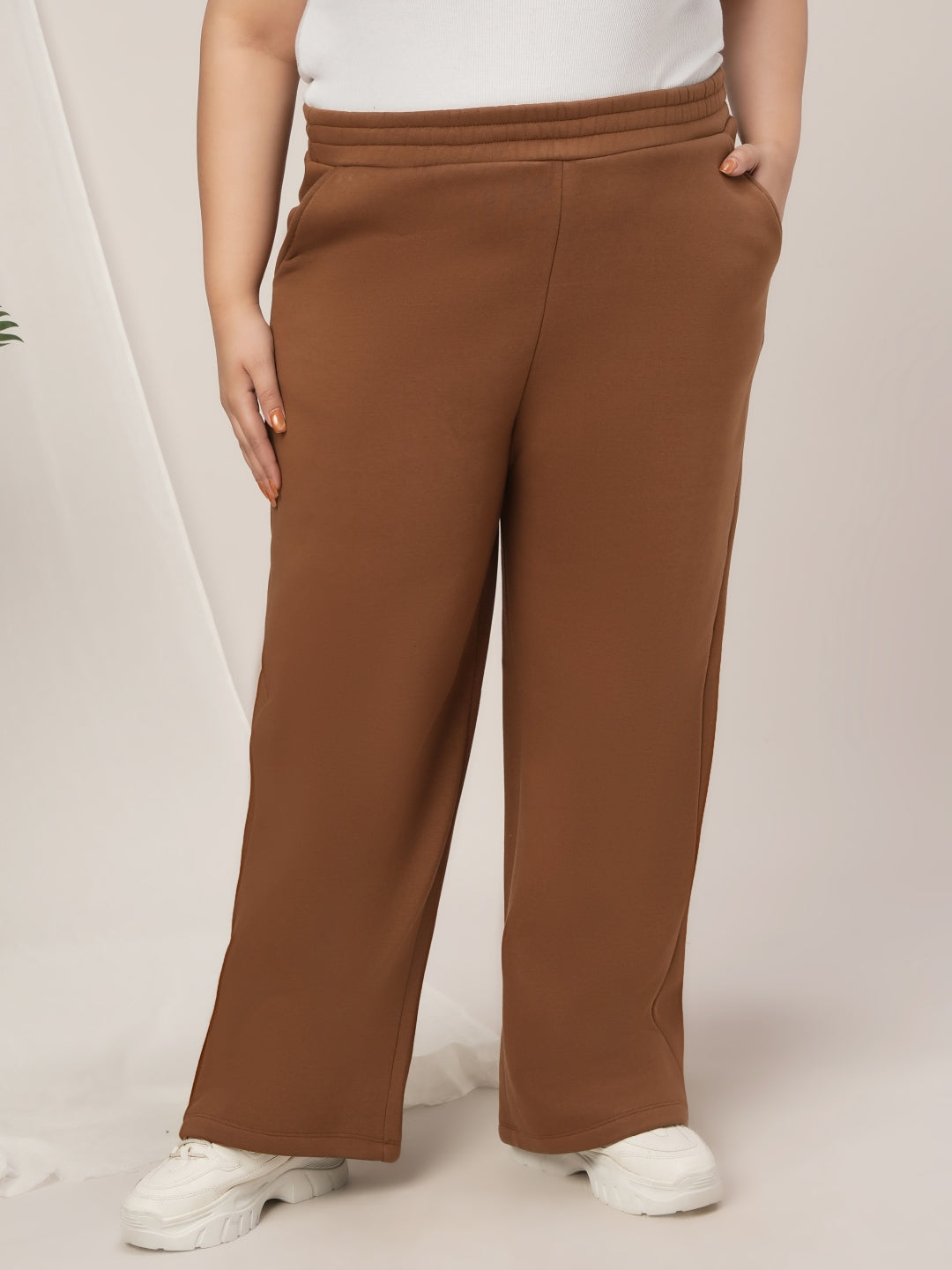 Women plus-size brown wide-leg winter fleece pants combine cosy warmth with modern versatility. Made from cotton fleece-backed jersey with a soft fleece lining, these high-rise pants feature medium stretch, a relaxed fit, and a wide-leg silhouette for effortless comfort. With two functional pockets and a pull-on closure, they’re perfect for lounging, travel, or everyday winter wear with easy, stylish appeal.