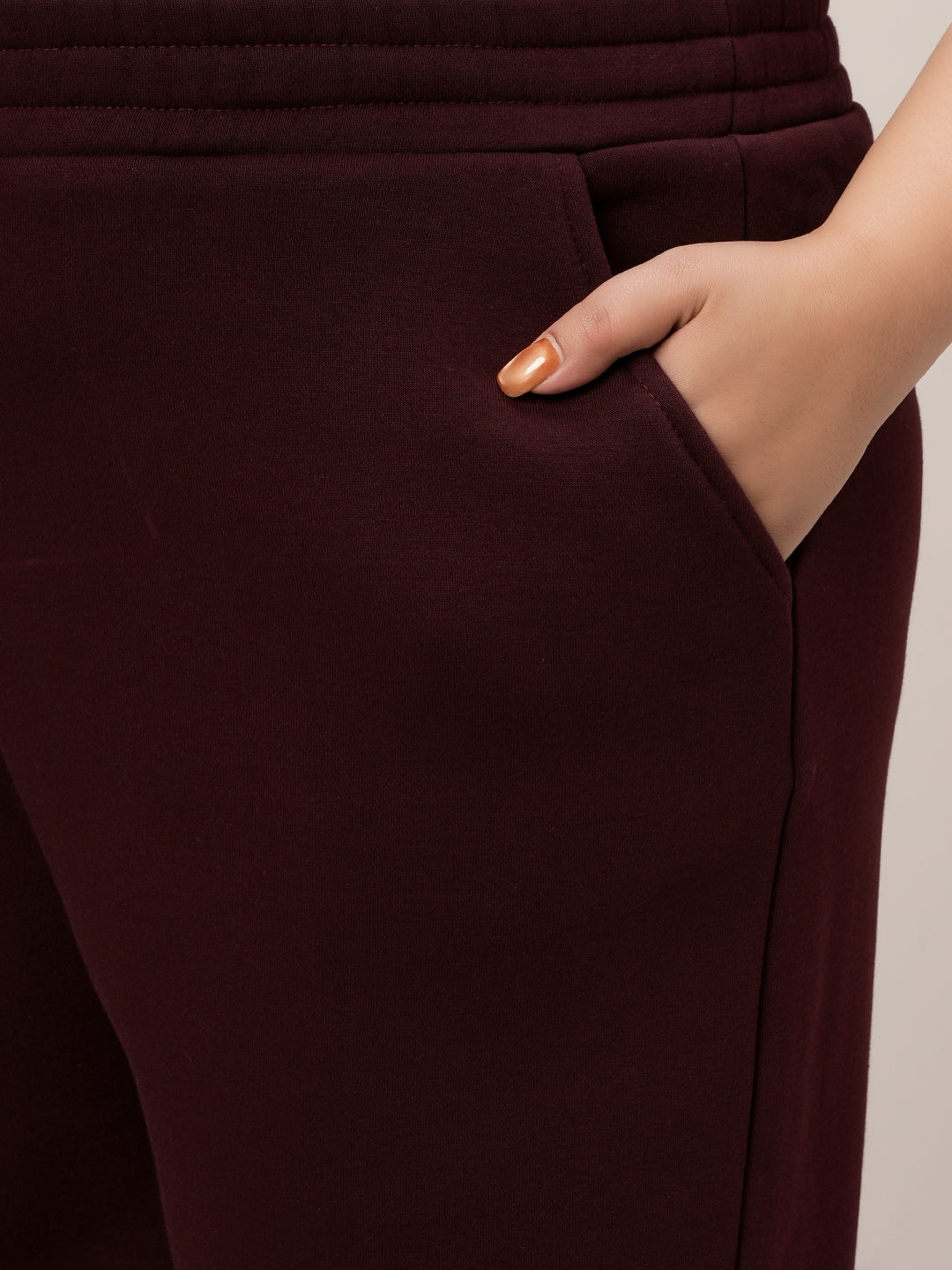 Women plus-size maroon wide-leg winter fleece pants bring warmth, comfort, and easy style to chilly days. Made from soft cotton fleece-backed jersey with a full fleece lining, these high-rise pants feature medium stretch, a relaxed fit, and a flattering wide-leg silhouette. Complete with two practical pockets and a pull-on closure, they’re ideal for lounging, travel, or casual winter outings with effortless elegance.