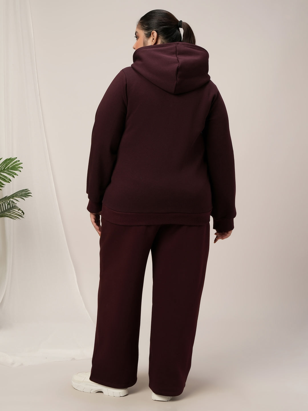 Women’s plus size winter matching set in maroon combines cozy warmth, flexibility, and refined winter style. Made from soft cotton fleece-backed jersey with medium two-way stretch for comfort and ease of movement. The zip-up hooded jacket features a drawstring neckline, roomy long sleeves, and patch pockets for warmth and functionality. Matching high-rise wide-leg pants are fully fleece-lined for insulation and softness, offering a relaxed fit, wide-leg silhouette, and easy pull-on closure. Designed with two functional side pockets, this set is perfect for lounging, travel, or casual winter outings — delivering comfort, coverage, and timeless maroon elegance.