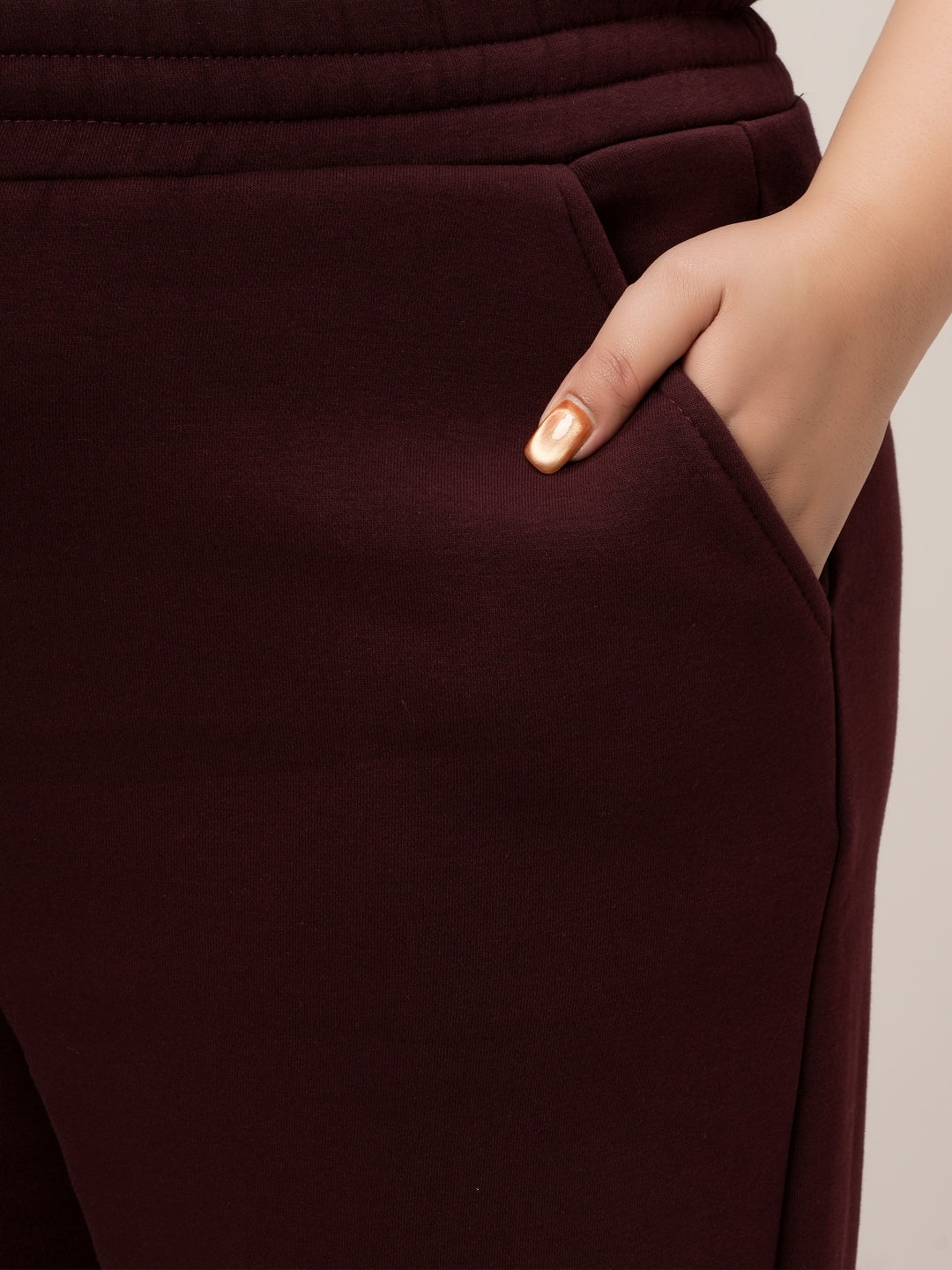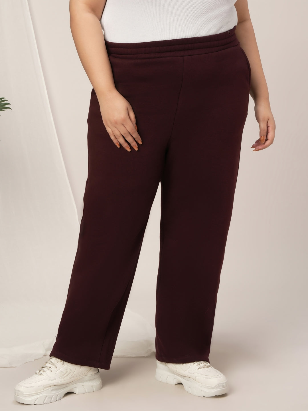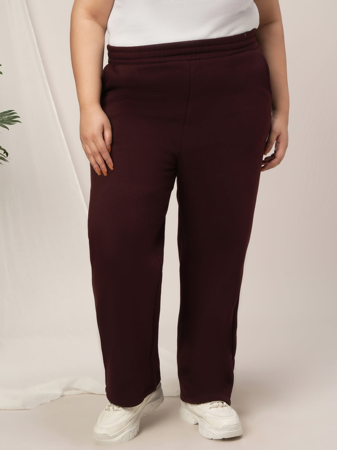 Women plus-size maroon straight-fit winter fleece pants combine warmth, ease, and timeless comfort. Made from soft cotton fleece-backed jersey with a cosy fleece lining, these high-rise pants feature medium stretch, a relaxed fit, and a straight-leg silhouette for effortless movement. With two practical pockets and a pull-on closure, they’re ideal for lounging, travel, or casual winter wear with everyday style and comfort.